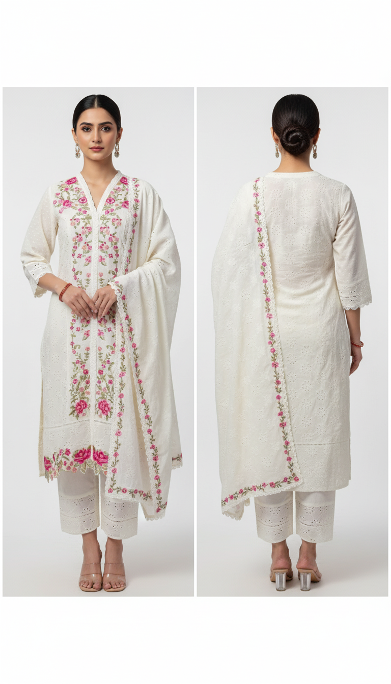 • Design: Often featuring matching prints, subtle embroidery, or delicate borders, the dupatta complements the kurta without overpowering its simplicity.